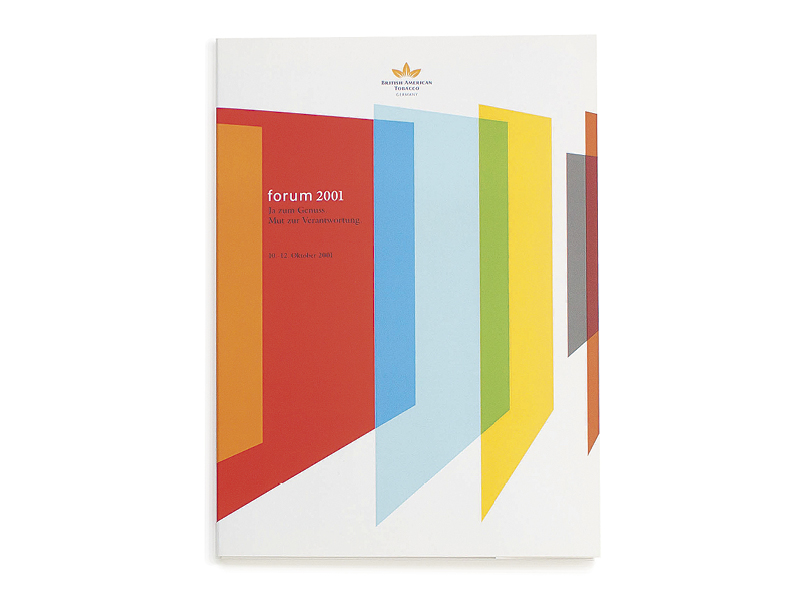 Mit dem Forum 2001 unter dem programmatischen Titel »Ja zum Genuss. Mut zur Verantwortung.« will British American Tobago Wege aufzeigen, wie Industrie und Handel diese Zukunftsaufgabe lösen können. Im Mittelpunkt von Vorträgen Workshops und eines offenen Meinungsaustausches, sollen unsere Antworten stehen. Die Frage ist, wie wir uns darauf einstellen werden und wie wir in Zukunft in einem veränderten Umfeld erfolgreich agieren können! Für das BAT Forum 2001 wurden alle Medien wie Einladungskarte, Menükarte, Mappen und Papierunterlagen für die Veranstaltung entwickelt. Die British American Tobacco ist das zweitgrößte privatwirtschaftliche Tabakunternehmen weltweit. Die Gruppe ist in rund 180 Ländern vertreten und hat ihren Hauptsitz in London.